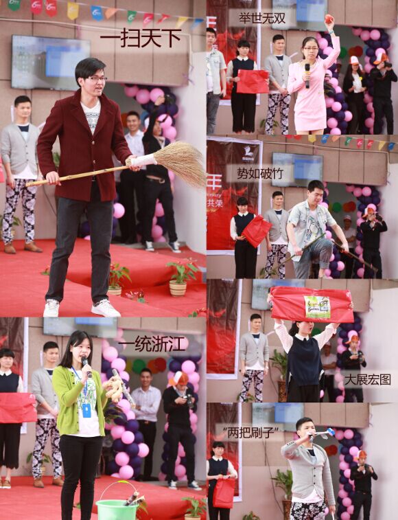 下面是技術(shù)部周年獻(xiàn)禮環(huán)節(jié),聯(lián)欣技術(shù)部現(xiàn)在已經(jīng)是六十余人的大團(tuán)隊(duì),這里的家人來自于祖國的五湖四海,我們帶著共同的夢(mèng)想來到聯(lián)欣,為了這個(gè)共同的夢(mèng)想而努力奮斗。技術(shù)部給聯(lián)欣獻(xiàn)上的第一份禮物是一首用河南話、重慶話、廣西話、溫州話、江西話、閩南話共同演繹的詩詞《聯(lián)欣,你正年輕》,說出太多人的心聲。聯(lián)欣,從2009年的十余人,發(fā)展到現(xiàn)在四百余人的大家庭,聯(lián)欣取得的每一份成績,都離不開這些來自五湖四海的家人們的共同努力與付出。他們用自己不同的家鄉(xiāng)話表達(dá)出對(duì)聯(lián)欣美好的祝愿,祝聯(lián)欣——一掃天下(一個(gè)掃把),一統(tǒng)浙江(一個(gè)水桶,里面乘著甘蔗和生姜),舉世無雙(一個(gè)西紅柿),勢(shì)如破竹(輕松折斷一根竹子),也祝聯(lián)欣的每一位伙伴每人都有兩把刷子(嘻嘻,是馬桶刷)。技術(shù)部用詼諧幽默的方式,表達(dá)出了對(duì)聯(lián)欣最美好的祝愿。