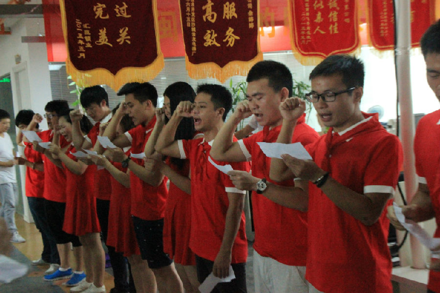 主持人用一段豪言貫穿著王者歸來自成立以來的輝煌戰(zhàn)績(jī)開場(chǎng),巔峰團(tuán)隊(duì)、黑馬前八、連斬狂客。。。。這些輝煌的戰(zhàn)績(jī)都足足表明王者之師的霸氣姿態(tài)。感恩之心,行動(dòng)于行,王者歸來老大余經(jīng)理站在臺(tái)前“他感恩公司給他這樣一個(gè)機(jī)會(huì),也堅(jiān)信這一戰(zhàn)他會(huì)帶著他的團(tuán)隊(duì)打的漂亮,實(shí)力打造非凡,王者絕非偶然”。繼承中華老一輩人的革命傳統(tǒng),客戶運(yùn)營(yíng)部的伙伴們更是以紅領(lǐng)巾相送,并佩戴在這些即將奔赴樂清戰(zhàn)場(chǎng)的兄弟們,讓這個(gè)團(tuán)隊(duì)紅上加紅。伙伴們激情昂揚(yáng)、立定心志,追求卓越,在老大的帶領(lǐng)下他們進(jìn)行宣誓“我宣誓,我自愿加入王者歸來團(tuán)隊(duì)。。。。堅(jiān)信今后的樂清會(huì)成為公司最強(qiáng)大的區(qū)域”一段激情澎湃的宣誓,一個(gè)個(gè)堅(jiān)定的面孔和一顆顆充滿戰(zhàn)斗的心,讓在場(chǎng)的每位聯(lián)欣人都相信他們能夠成功,在樂清開疆拓土!