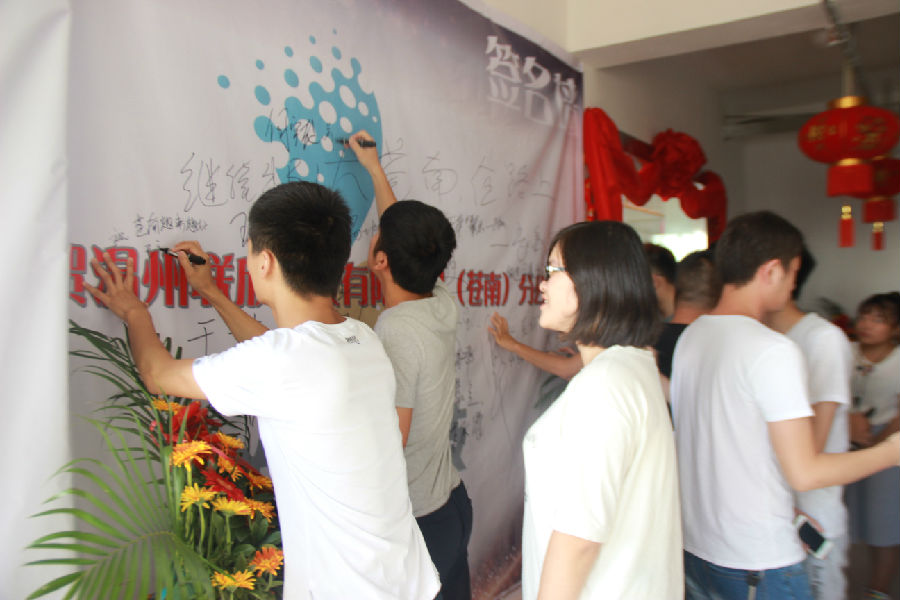 各位小伙伴們在簽名墻上簽名留念。