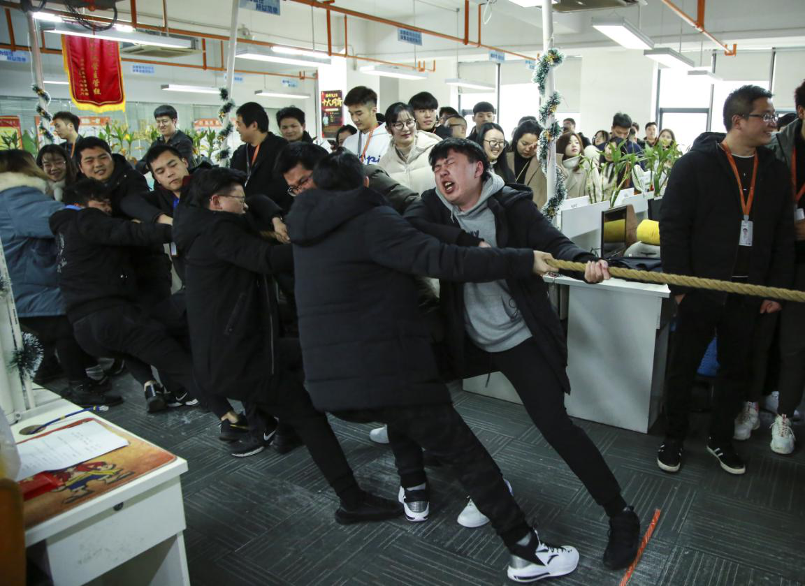 為了幫助伙伴們快速進(jìn)入狀態(tài),首先進(jìn)行的是緊張刺激的拔河比賽,六個(gè)小隊(duì)決勝前兩名。隨著裁判員的一聲哨響,只見運(yùn)動(dòng)員們緊握繩子,鼓足了勁拼命地往自己的一方拽。此時(shí)比的是隊(duì)員們的大局意識(shí)、協(xié)作精神和毅力,而雙方啦啦隊(duì)的吶喊聲,其它伙伴們的助威聲、加油聲響徹在每一個(gè)角落,現(xiàn)場(chǎng)到處都是歡聲笑語。