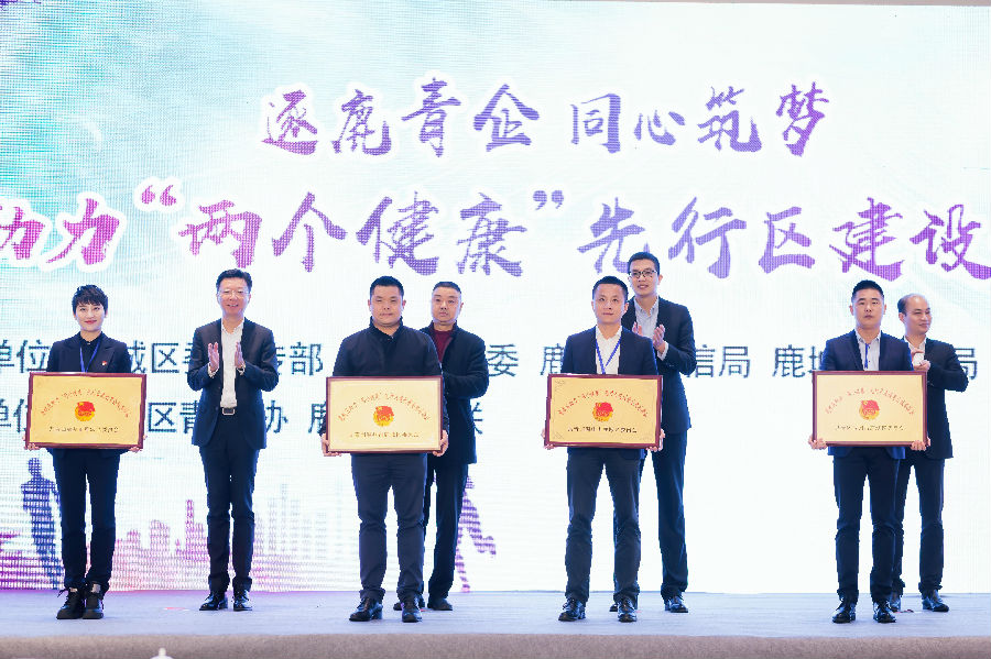在場領導共同為鹿城區助力“兩個健康”先行區建設青企服務驛站授牌。