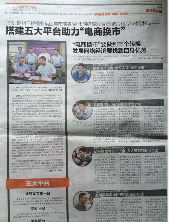 本次內容還刊登到溫州都市報A10版,這樣廣大市民能更詳盡的了解到“搭建五大平臺助力‘電商換市’”的內容,共同推進溫州市電商事業的進一步發展。